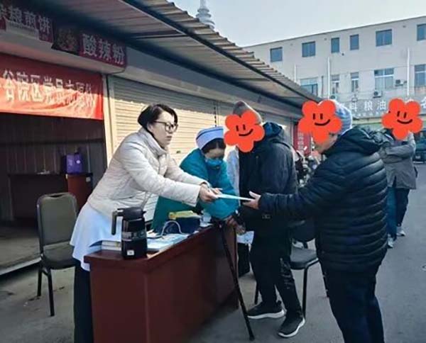 自2025年11月20日起连续四周,每周四上午8:30-10:00,由中国中医科学院望京医院平谷院区9个在职党支部所辖科室轮值参与,涵盖针灸、推拿、脾胃病、心血管病、脑病、康复科等多个专科。每次活动派出3名志愿者(医生、护士、行政人员各1名),提供血压、血糖测量、中医体质辨识、养生指导及常见病健康宣教等一站式服务。12月11日由内科二党支部心血管病科李敏静副主任医师、护士长赵芳、药学部潘珂佳主任药师领衔为居民提供服务。她们认真细致地为患者测量血压、血糖,耐心专业地进行健康宣教,用实际行动诠释着医者的仁心与担当。